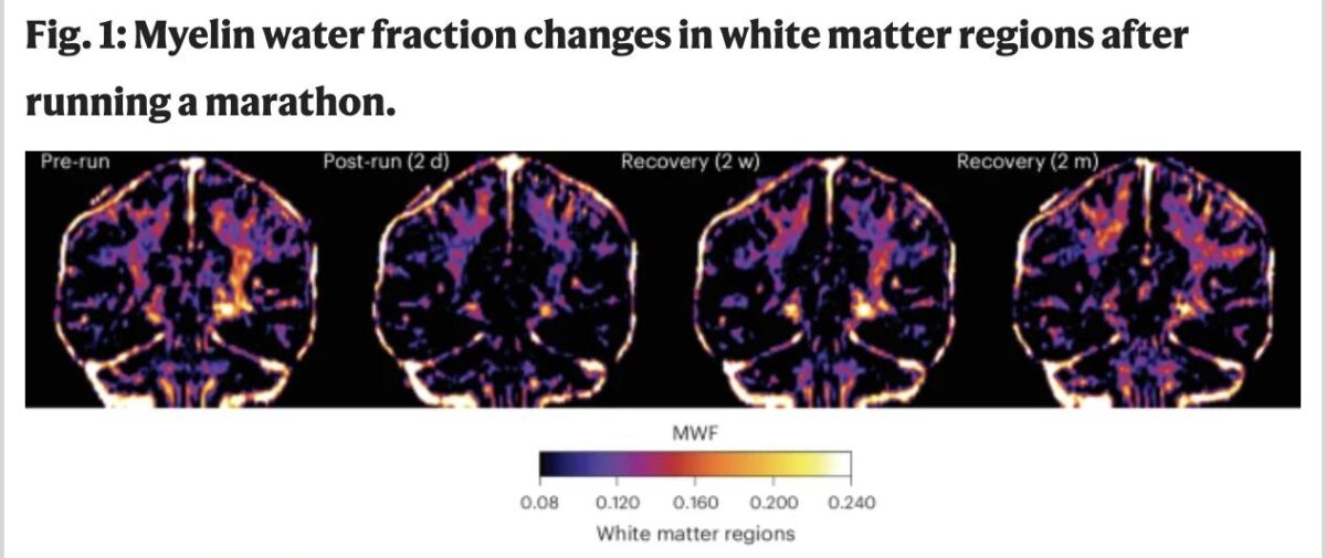 Nos exames realizados entre 24 e 48 horas após a corrida, os pesquisadores segmentaram o cérebro em cinquenta regiões de substância branca (rica em mielina) e descobriram que, em 12 dessas regiões, a fração de substância branca (MWF) havia diminuído. Isso indicou uma redução temporária no conteúdo de mielina. As maiores quedas, de 28% e 26% respectivamente, ocorreram em áreas que auxiliam no movimento e na coordenação, no processamento de sentimentos e informações sensoriais.